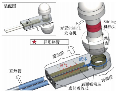 5.2 异形高温热管的尝试空间实际应用中异形热管的设计更符合应用需求[16, 90],但当前空间用高温热管的研究大多局限于传统直形热管,较少关注异形高温热管的设计与研究。许多研究对中低温热管的弯曲效应进行了探索,证明了弯曲对热管性能有显著影响[125-128],而高温热管的相关研究较少。在数值模拟方面,Hu等[129]建立了考虑Marangoni效应和弯曲效应的改进集总参数模型,模型模拟了HP-STMCs中超长且含有弯曲结构的锂热管稳态运行情况。研究结果表明,弯曲引起的蒸气压降约占总压降的22%~23%,液体压降的影响可以忽略不计。在异形热管设计研究方面,Liu等[130]设计制造了一种与Stirling机耦合的核反应堆用异形热管,其结构如图 8[130]所示,利用动脉直接连接冷凝面和蒸发面,大大缩短了两者之间的液体输送距离。动脉为液体提供单独的流道,在保证高毛细力的同时,还能显著降低液体回流损耗。
