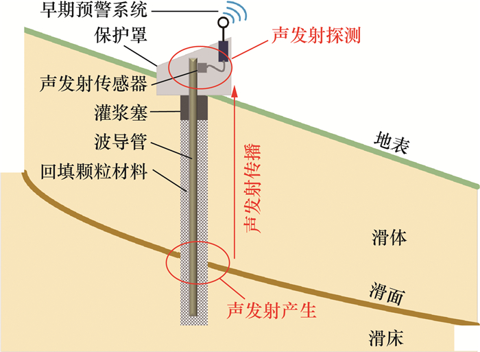 然而,声发射技术一般用于岩质滑坡监测,用于土质滑坡监测的相关研究较少,原因是土质滑坡变形破坏过程中产生声发射的事件较少、能量水平较低,声发射弹性波在土体多孔材料中传播衰减快,信号易受环境噪声干扰[15-16]。为解决上述问题,滑坡监测时常用波导管作为声学波导(以下简称“波导”)以采集声发射信号[12, 17-20]。无源波导通过在波导管周围灌浆制成,常用于监测岩质滑坡[13-21];波导管与填充颗粒结合形成的有源波导常用于监测土质滑坡[9-10, 12]。