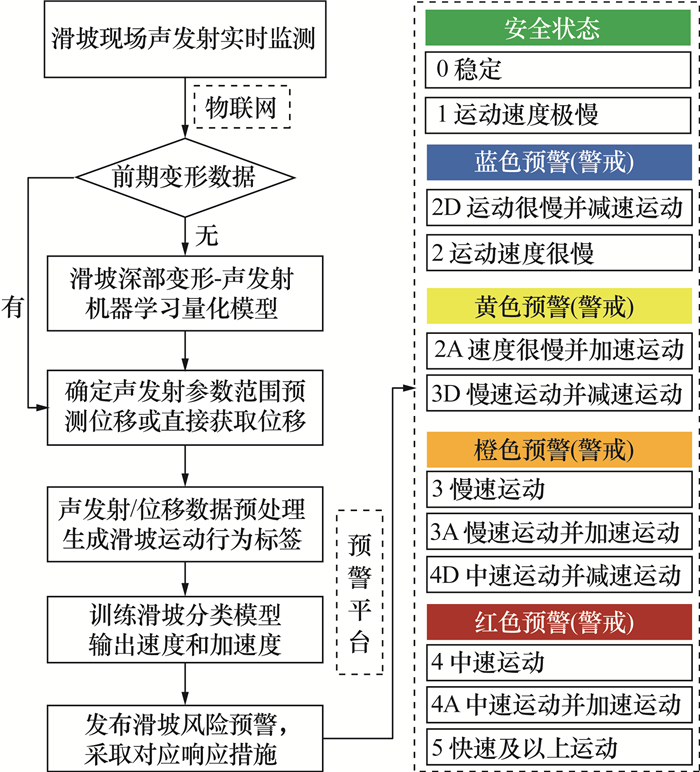 1.3和1.4节阐明了利用机器学习模型和声发射数据量化滑坡深部变形行为的分析方法。机器学习模型的优势在于适用性更强、预测更准确且自动化水平高,能快速高效地输出滑坡位移、速度和加速度等关键参数。与以往研究相比,文[39-40]新增了加速度信息和对应的声发射参数(振铃计数变化率),为滑坡风险预警提供了新的有效判据。在滑坡深部变形-声发射关系量化模型的基础上,进一步提出声发射监测与机器学习结合的滑坡风险分级预警方法(见图 10),主要根据滑坡速度分级标准和加速度状态推测滑坡发生的可能性及危险程度,通过生成预警级别建议并采取响应措施达到防灾减灾的目的。预警级别中的每个运动状态标签都定义了明确的速度范围和加速度状态,实际应用中可操作性强。例如,“2A”表示滑坡速度为0.002~0.200 mm/h并处于加速运动状态,如果滑坡标签在一段时间内持续为“2A”,建议发布黄色预警。