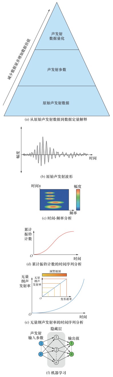 基于滑坡监测数据定量分析解释等研究成果,图 11给出了从声发射监测数据中提取滑坡变形关键信息以制定决策的概念框架[42]。图 11a中,自下而上表示声发射数据量减少而数据价值增加。图 11b和11c表示从声发射原始波形数据提取特征参数,并将获取的声发射特征参数作为数据解释模型的输入。图 11d和11e表明可使用时间序列方法分析解释声发射数据,提供滑坡速度变化率,即加速变形行为的信息。图 11f利用机器学习模型,输入声发射监测数据进行训练,输出滑坡深部变形行为相关信息,支撑灾害风险早期预警和决策。