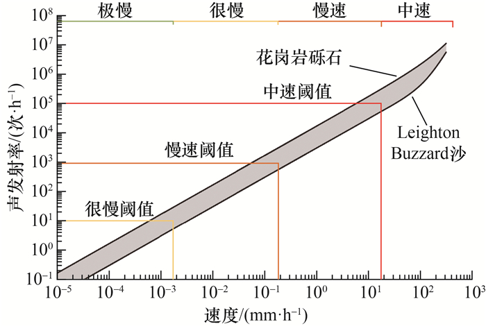 Dixon等[33]通过有源波导压缩实验发现,利用声发射参数可识别滑坡速度的数量级变化,进而依据滑坡速度分级标准(见表 1[1-2])评估滑坡危险性。为进一步量化声发射率和滑坡速度的关系,Smith等[8]开展了滑坡大尺寸模型实验研究,考虑了回填颗粒等变量对声发射数据的影响,得到的有源波导声发射率-剪切速度标定关系如图 3所示。有源波导声发射率主要响应于滑坡速度,速度升高引起单位时间内颗粒-颗粒和颗粒-波导相互作用增大[34],即声发射事件数量增加。声发射率的数量级对应一定的滑坡速度级别,可根据滑坡速度分级标准确定相应的预警级别,以指导相关人员及时采取针对性响应措施。例如,通过声发射率发现滑坡速度依次处于“很慢” “慢速”和“中速”区间时,对应不同级别的预警。声发射监测技术可准确识别滑坡的加速变形行为,为灾害早期预警提供依据。综上所述,滑坡原位监测和大尺寸模型实验均表明声发射率和滑坡速度存在正相关关系(见式(1)和图 3)。