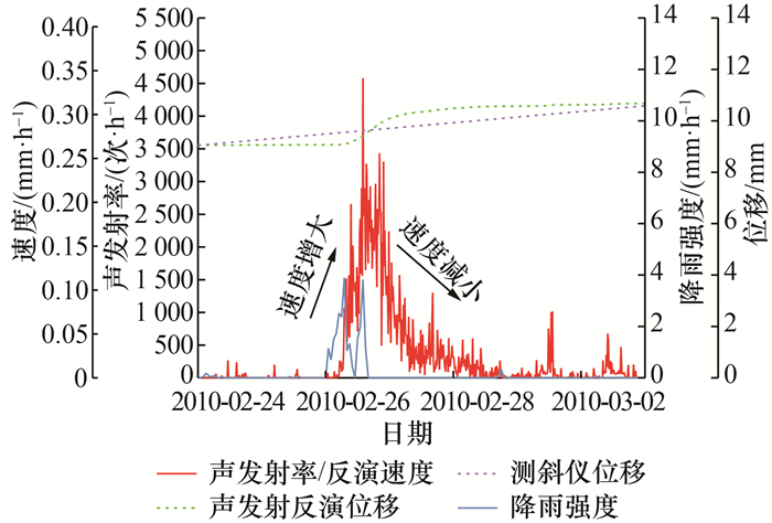 若设定的采集时间间隔较大,则滑坡原位监测获取的位移数据可能不连续,不利于有效分析滑坡深部变形行为,可考虑基于连续声发射数据反演滑坡位移和速度。基于声发射率和滑坡速度存在近似正比关系的假设,Dixon等[10]提出了从滑坡运动事件中计算得到Cp的方法。滑坡深部变形是产生声发射的原因,滑坡深部变形与声发射在物理过程上存在直接响应机制,在数学关系上近似表现为正比例函数(见式(1)),通过声发射数据可反演得到滑坡位移和速度。Hollin Hill滑坡的声发射、位移和降雨时间序列如图 4所示。例如,在图 4中,测斜仪人工监测的位移仅有始末端2个数值,为精细分析滑坡变形过程,假设声发射率-时间曲线与坐标轴围成的面积等于测斜仪测得的位移增量,可得到该滑坡运动事件的连续位移和速度曲线。