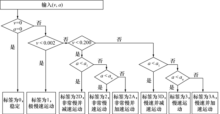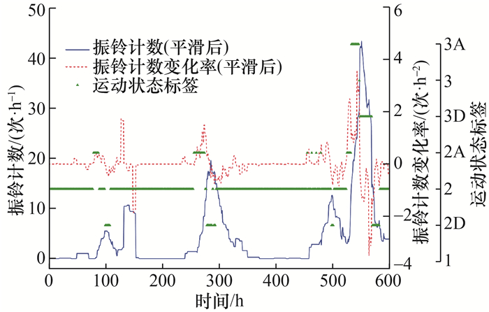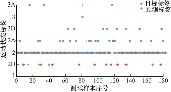 图 5展示了滑坡模型实验的监测数据(图中数值已无量纲化处理),红色圆点表示用于训练的数据集(数据占比为70%),绿色五角星表示用于测试的数据集(数据占比为30%)。数据点代表 2个声发射特征参数和相应的运动学标签,标签根据SAA位移测量值生成,每个标签具有特定含义,如“2”表示非常慢速运动,“3”表示慢速运动,“2A”表示滑坡速度为0.002~0.200 mm/h并且处于加速(accelerating)状态,“3A”表示慢速并加速运动,以此类推。在训练过程中,使用上述2个声发射特征参数和真实标签训练分类器;在测试过程中,仅将2个声发射特征参数输入训练后的分类器,根据声发射数据预测运动学标签;随后将预测标签与真实标签进行比较以评估分类器的性能。性能评估采用准确率,即正确预测标签数占标签总数的比例。计算结果表明,3种分类算法中,RF模型表现最好,分类准确率始终高于90%。除了将分类模型在实验室数据集上测试验证,还利用滑坡现场监测数据验证模型。Hollin Hill滑坡设计的八标签运动速度分类流程如图 6所示,考虑参数包括速度和加速度类别,其中,加速度a由速度计算得到,单位为mm/h2, 通常在0附近以极小幅度波动,a处于(al, au)内仍可视为滑坡匀速状态,au表示加速度正值,al表示加速度负值。图 7为2016年3—4月监测得到的Hollin Hill滑坡声发射参数曲线及由SAA测量值生成的运动学标签时间序列,同样70%的数据用于训练、剩余30%的数据用于测试,图中D表示滑坡运动处于减速状态(decelerating)。RF模型对Hollin Hill滑坡测试集的分类结果如图 8所示,经计算可知,RF模型应用于滑坡现场数据的分类准确率高于90%。