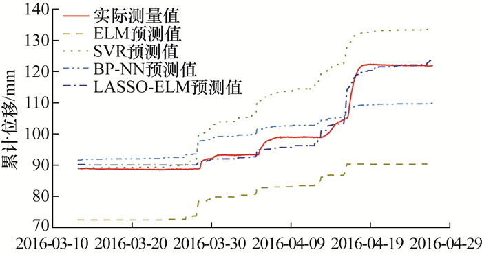 1.3节阐述了基于声发射监测数据和机器学习分类模型开发的滑坡运动学状态自动识别方法,根据速度级别和加速度状态可得到应触发的预警级别。支撑该滑坡分级预警方法的另一基础是持续的高精度深部变形信息,Deng等[39]提出了基于机器学习的滑坡位移预测方法,即利用声发射和相关参数(如降雨量)自动量化滑坡位移的绝对量。与之前建立的经验公式(1.1和1.2节)相比,机器学习回归模型量化滑坡深部变形行为的准确性更高,解决了滑坡深部位移数据的可持续获取问题。基于滑坡现场监测数据集,选取Hollin Hill滑坡的声发射、降雨量和位移监测值用于训练回归模型;将声发射和降雨量输入训练后的模型,输出滑坡位移预测值。图 9比较了极限学习机(extreme learning machine,ELM)、支持向量回归(support vector regression,SVR)、反向传播神经网络(back propagation neural network,BP-NN)和基于最小绝对值收敛和选择算子的极限学习机(least absolute shrinkage and selection operator-extreme learning machine,LASSO-ELM)4种模型的滑坡位移预测结果,LASSO-ELM预测的位移曲线最接近实际测量曲线,且整体性能最佳,平均绝对百分比误差(mean absolute percentage error,MAPE)为1.5%。
