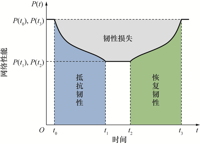 1 交通网络韧性 1.1 2阶段韧性交通网络韧性包括抵抗扰动影响和从扰动中恢复的能力[3]。Bešinović[18]认为铁路网络的韧性是指铁路系统在正常情况下提供有效服务,以及面对中断或自然灾害能够抵抗、吸收、适应和快速恢复的能力。杨琦等[19]认为韧性是指一个系统能够有效抵御、吸收、适应干扰,并从干扰中恢复的能力,核心为系统的抗干扰和恢复能力。Zhou等[20]认为交通网络的韧性由以下2方面构成:1) 中断情况下,维持功能的能力;2) 中断后,恢复性能所需的时间和资源。综上所述,可认为韧性主要包含抵抗和恢复2个阶段,如图 1所示。t0和t1分别为扰动发生和结束时刻;t2和t3分别为恢复开始和完成时刻;P(t)为t时刻的网络性能响应函数。
