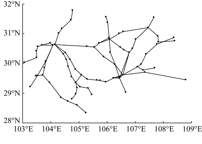 4.2 成渝城市群铁路客运网络在百度地图拾取坐标系统中采集每个铁路客运站的经纬度坐标信息。基于站点经纬度坐标和邻接矩阵,借助MATLAB绘制基于Space L的成渝城市群铁路客运网络,如图 2所示。