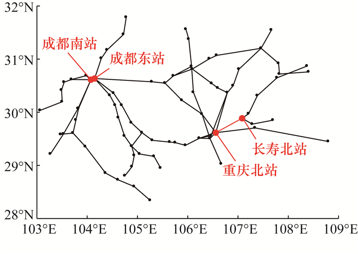 4.4 相似性从相似性来看,3种铁路网络中的第54条连边成都东站—成都南站区间路段中断,使网络性能保留率均低于0.880 0;第25条连边重庆北站—长寿北站区间路段中断,使网络性能保留率均低于0.950 0;除第25和54条连边,以及G1中的第5条连边外,其他连边中断后的网络性能保留率均高于0.950 0;第54条连边的可替代能力最低,该连边中断最高可使网络性能损失12.23%。成渝城市群铁路客运网络第25和54条连边如图 4所示。