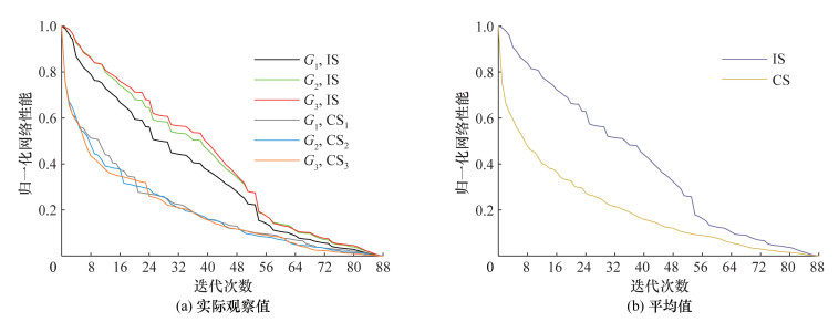 4.8 多路段连续中断韧性将E中的排序设定为路段初始排序(initial sort, IS),分别对G1、G2、G3的路段按照可替代能力由低到高进行排序,得到3种网络路段的关键性排序(critical sort, CS),分别为CS1、CS2、CS3。按照IS和CS,对3种铁路网采取多路段连续删除的攻击模式进行抵抗韧性仿真,对网络性能进行归一化处理(网络性能缩放至0~1范围内,且初始性能为1),多路段连续删除的网络性能曲线如图 5所示。