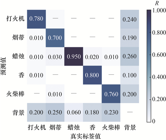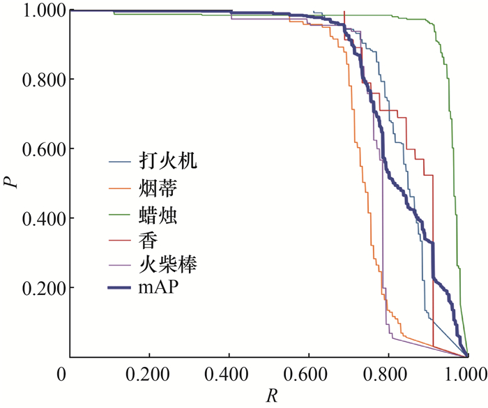 检测模型在验证集上的P-R(precision-recall)曲线如图 10所示,图中打火机、烟蒂、蜡烛、香和火柴棒的目标平均精确率为0.839、0.743、0.949、0.851和0.767,所有类别的目标mAP为0.830。
