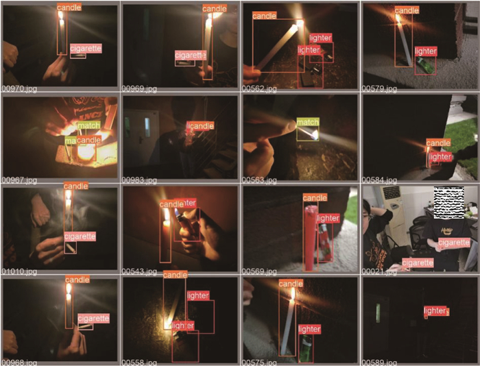 将模型在验证集的首批图像上进行了测试,结果如图 11和12所示。图 11显示了模型的预测标签,可知模型清晰地标记了各个消防危险品目标。然而,在预测阶段仍然存在一些误检和漏检的情况,如图 12所示,在第2张图像中,蜡烛(candle)目标被错误标记为火柴(match)目标;在第一张图像中,虽然模型能正确识别蜡烛(candle),但未检测到烟蒂(cigarette)。此外,检测模型在小目标和被遮挡目标的检测方面表现出色。该检测模型对于困难样本的检测具有较高的准确性和鲁棒性。