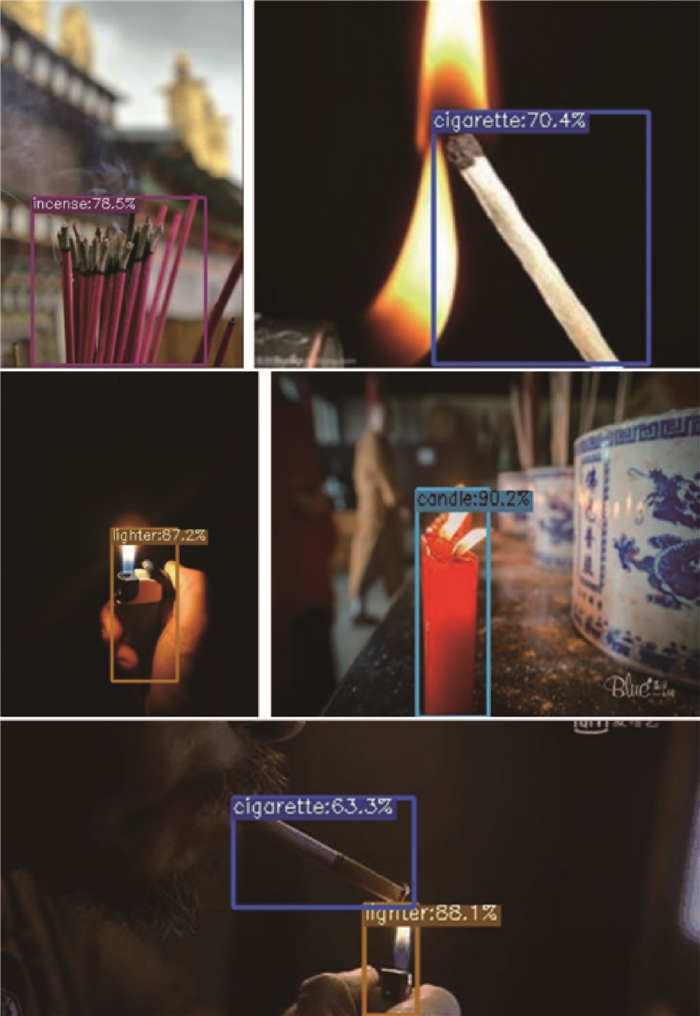 5) 在自建数据集上训练检测模型,实现了对烟蒂、火柴棒、打火机、蜡烛和香等消防危险品的实时检测。模型的mAP和精确率分别达0.830和0.940,具备竞争力,例如,在服务器上运行时,模型推理速度可达92 fps。