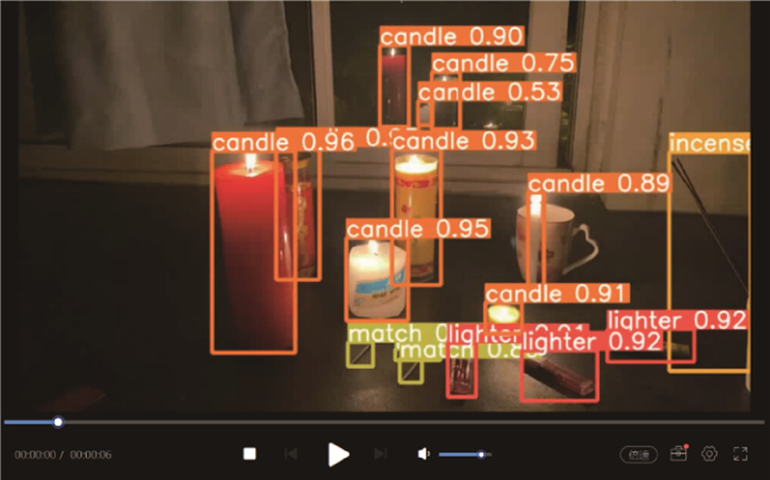 为了进一步验证模型的可行性,本文收集了消防危险品的图像和视频,验证结果如图 13和14所示。结果表明,模型能准确检测图像中危险品的类别并进行定位。而在视频中,尽管存在物体数量较多且物体之间相互重叠的现象,模型仍保持较高的准确率。由视频检测结果可知,蜡烛和打火机的检测准确率较高,原因是其在图像中占比较大;同时模型也能准确检验到火柴棒等小物体,表明本文提出的检测模型有效。