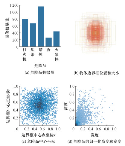 另外,本研究对数据集中的文物古建筑消防危险品进行了详细的数据分析,数据量统计结果如图 4a所示。图 4b显示了每个物体边界框的位置和大小,图中橙色方框表示边界框的位置。图 4c中显示了危险品的中心点坐标(x, y),图像中心的颜色较深且数据点密集,说明大部分数据集图像中的消防危险品位于图像中心,并且具有完整的特征。图 4d显示了危险品的高度和宽度,数据以物体宽高与图像宽高的归一化值呈现。数据图的左下角颜色较深且数据点分布密集,表明目标检测中的小目标危险品占比较大。