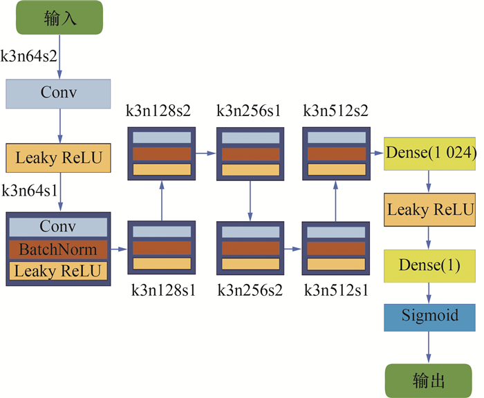 SRGAN采用反卷积层进行上采样,并使用tanh激活函数限制输出范围,通过Sigmoid函数输出图像的真伪概率判别网络。生成网络和判别网络交替训练,生成网络最小化图像与实际图像之间的均方误差(mean-square error,MSE),同时最大化判别网络的输出损失,从而学习生成更真实、分辨率更高的图像的能力。SRGAN判别器模型的结构如图 6所示。图 6中Conv表示卷积层,Leaky ReLU表示激活函数,Dense表示全连接层,k后的数字表示卷积核的尺寸,n后面的数字表示卷积输出的通道数,s后面的数字表示步长。