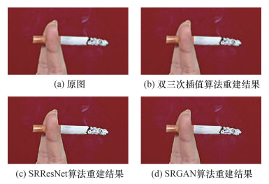 图 7显示了经过双三次插值、SRResNet及SRGAN算法处理前后的烟蒂图像。相对于双三次插值和SRResNet算法,SRGAN消除了原始图像的模糊感,重建后的图像更自然,提高了数据集图片的质量。使用SRGAN重建图片操作更简便,可逼真地还原烟蒂的细节纹理,使重建的图像在视觉上与真实图像更加接近。