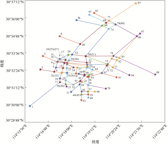 2.3 微博签到数据采用微博签到数据采集系统爬取武汉市武昌区2022年1月1日至2022年12月31日的微博签到数据,获取的属性信息包括定位纬度、定位经度和定位地名,统计武汉大学、武昌江滩、湖北大学、武汉VOX Livehouse(武昌光谷店)、首义公园、武汉武昌万枫酒店和武汉工程大学武昌校区等289个地点的访问频次并导入MATLABR2020b软件,研究区域热点区域访问频次信息如表 3所示。