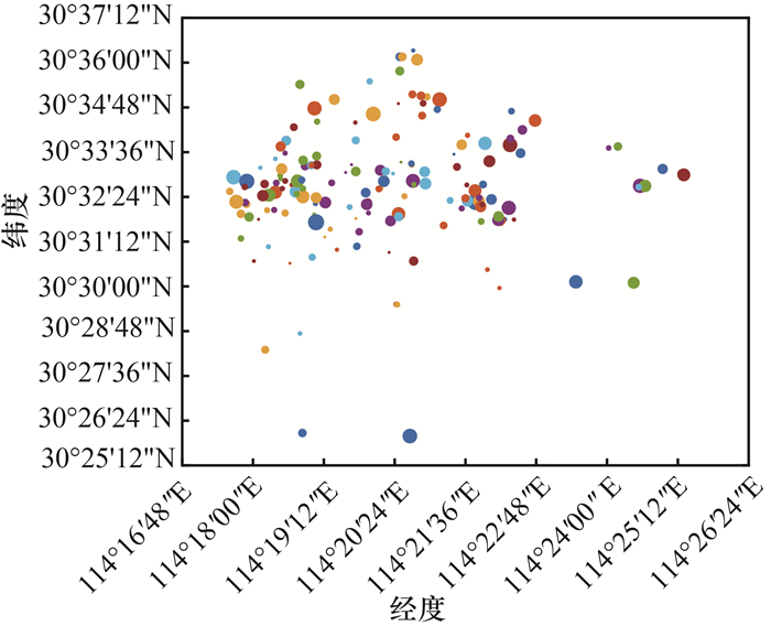基于路网数据和微博签到数据,基于K-means聚类方法分析得到武昌区人员热点区域,如图 2所示,其中圆点面积由大到小表示热度由高到低。由图可知,武昌区人员热点区域集中在武昌站、湖北大学、司门口、汤逊湖和武汉大学等地区。