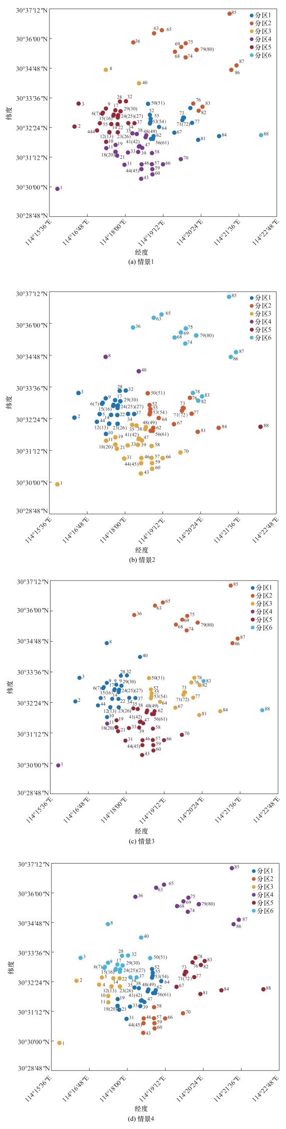 4类情景下,3号出口(武汉长江大桥武珞路段)均被选定为疏散出口,并承担了巨大的疏散压力,因为该路段毗邻黄鹤楼、湖北省人民医院和武昌火车站等人员聚集热点区域,且是连接武昌区和江汉区的主要道路;8号和81号出口因具有地理优势而被选择为疏散出口的概率较高,同时2个出口与热点区域的连接性差异使疏散压力产生差异。此外,增减车辆数量仅限于模拟洪水水域边界内的道路网络部分,因为这部分行程主要为短程[44]。由于起点和终点之间的距离和行驶时间相对较短,当空间受到如废弃路段等障碍物的影响时,可行的绕行路线有限,因此各分区内主要承流路段均呈汇流路段,且多处于受灾害影响路段密集区域内,其中在风险区间路段的连接部分并不会缓解疏散压力,这是因为在洪涝风险中,一旦一小段路段失去通行能力,就会导致整条路径失去作为优先疏散路径的“吸引力”,这是疏散计划中需要重点关注的部分。