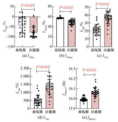 对表 1中的7项数据进行Shapiro-Wilk检验,结果表明各组呼吸信号指标均不符合正态分布(P<0.050),因此采用配对样本秩和检验的方法对地震情景下受试者基线期和应激期的呼吸信号指标进行显著性分析,显著变化(P<0.010)的结果共有5项,如图 4所示。