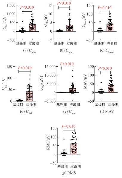 对表 2中的10项数据进行Shapiro-Wilk检验,各组肌电信号指标均不符合正态分布(P<0.050),因此选用配对样本秩和检验的方法对地震情景下受试者基线期和应激期的肌电信号指标进行显著性分析,显著变化(P<0.010)的结果共有7项,如图 5所示。