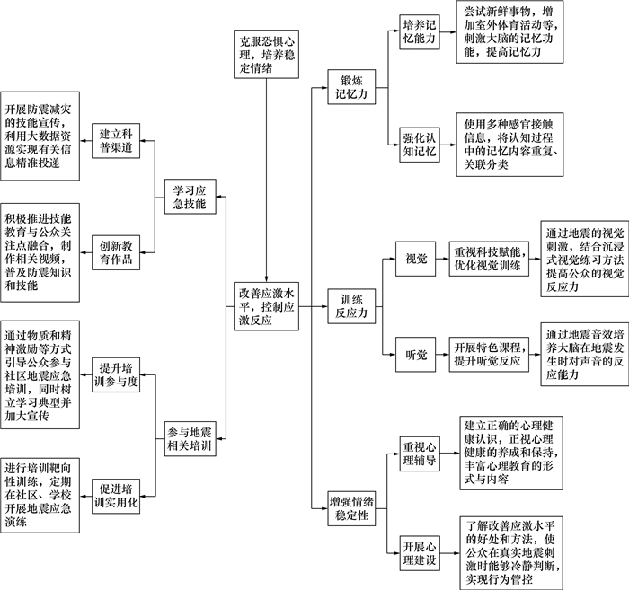 由于应激水平与人的复杂多变的应激情绪相关,而从影响因素来看,又与技能训练和培训经历相关。因此,需要相关部门与公众密切配合,并借助相关技术手段才能有效改善应激水平。应急技能方面,建议借助数据推送技术,提高宣传效率;地震培训和情绪稳定性方面,建议由单位和社区协助开展培训,宣讲逃生路线[33],营造自救知识学习氛围;记忆力和反应能力方面看,需要公众在了解技能提升方法后,制定适合自身的计划并坚持练习。为了科学有效地克服恐惧心理,控制地震应激反应,依照影响因素的分析结果,分类提出应激反应改善建议,如图 7所示。