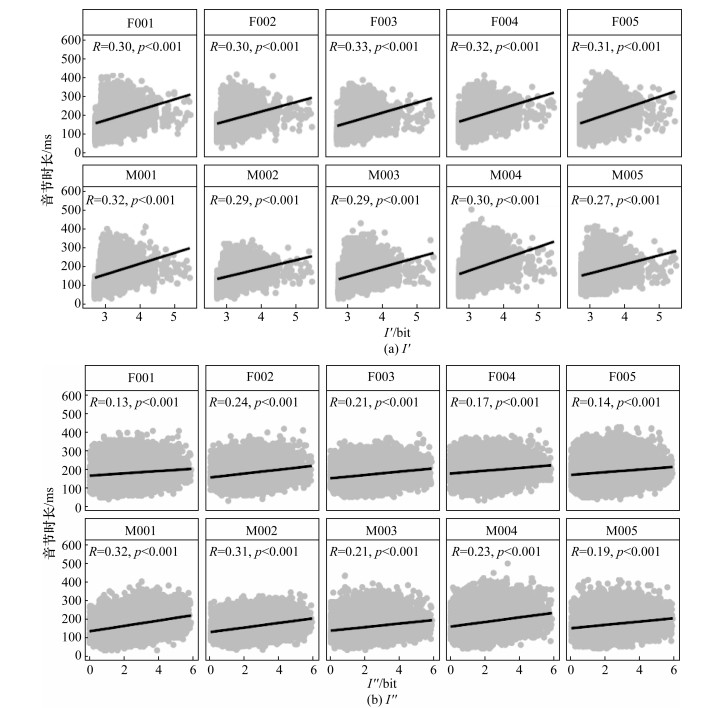 2 实验结果与分析 2.1 惊异度与音节时长在不同话者内的相关性本文首先考察了I′、I″与音节时长在每个说话人中的相关关系。如图 1所示(F001—F005表示5位女性发音人,M001—M005表示5位男性发音人),惊异度与音节时长在所有发音人中均呈显著的正相关关系,即音节信息量越大,说话人在产出时使用的时长越长。根据Pearson相关系数计算的结果,I′与音节时长的相关性约为0.30;I″与音节时长的相关性略低一些,约为0.20。同时,I′与音节时长的相关性更稳定一些,10位发音人的相关性都在0.27~0.33之间,而和音节时长的相关性波动更大一些,在10位发音人中,相关性范围为0.13~0.32。总的来说,在汉语普通话中,惊异度和音节时长在不同说话者中都具有较稳定的正相关关系。