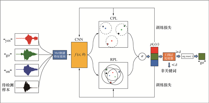 1.2 开放集识别开放集识别旨在正确区分已学习的目标类别,同时能拒绝未知的非目标类别。Bendale等[13]将深度学习引入开放集识别中,证明由Softmax层得到的概率阈值不能产生具有鲁棒性的开放模型,并提出了利用OpenMax对激活向量的距离建模来检测未知类。Ge等[30]扩展了OpenMax,提出generative OpenMax,利用生成模型生成的未知样本训练DNN。然而,上述方法仍受到Softmax分类器封闭性的限制。Yang等[14, 31]提出了CPL,用面向开放场景的卷积原型网络替换具有闭集性的Softmax分类器,根据样本与原型的相似度学习类别特征。Chen等[15, 32]从原型聚类的反方向出发,提出了RPL,根据样本与互斥点之间的差异信息,对样本进行判别。上述方法在图像的开放集识别任务中性能较好。本文针对开放集场景下的语音KWS任务,引入CPL和RPL思想,使网络学习更紧凑的关键词类别特征,并构建了2种新型鲁棒轻量级KWS系统。