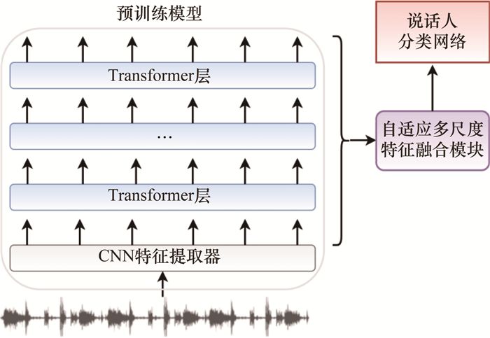 图 1中的模型J、A、C均使用图 2所示的基于预训练模型的说话人验证模型。预训练模型包含CNN(卷积神经网络)特征提取器和多层Transformer,多层Transformer的输出经过自适应多尺度特征融合模块送入下游说话人分类网络ECAPA-TDNN中,并最终生成192维的说话人嵌入。