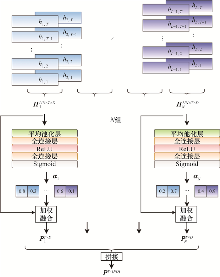 | $ \begin{equation*} \boldsymbol{P}_{n}^{T \times D}=\sum\limits_{i=1}^{L / N}\left(\boldsymbol{\alpha}_{n, i} \cdot \boldsymbol{H}_{n, i}^{T \times D}\right) \end{equation*}. $ | (1) |