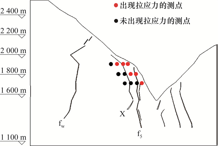 为分析低高程1 780 m深部裂缝的成因,取1 930、1 850、1 750 m高程50、100、200、250 m不同深度观测点,如图 11所示。记录其下切完成后的主应力值,如表 4所示。图 11中红点为河谷下切过程中出现σ3的测点。由图可知,出现σ3的区域主要在较浅位置,即1 700~1 930 m高程,且随着高程增加,卸荷深度逐渐增大。1 930 m高程出现拉应力的深度最大,约200~250 m。这与1 930 m高程出现深卸荷和1 780 m高程具有浅表层卸荷带的地质现象相符。