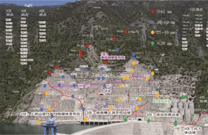 4 深部裂缝对边坡变形的影响 4.1 基于监测资料的边坡变形规律图 12(背景来自文[7])为运行期2014年8月24日至2022年7月29日锦屏左岸边坡表观测点分布与临空向变形情况,红点为变形量大于60.0 mm的测点。从空间分布来看,靠近坝肩测点的变形量大于远离坝肩测点,坝体拱推力对边坡临空向变形有阻碍作用。高高程位置表观变形大于低高程位置,表观变形主要来源于高高程区域的重力倾倒变形。