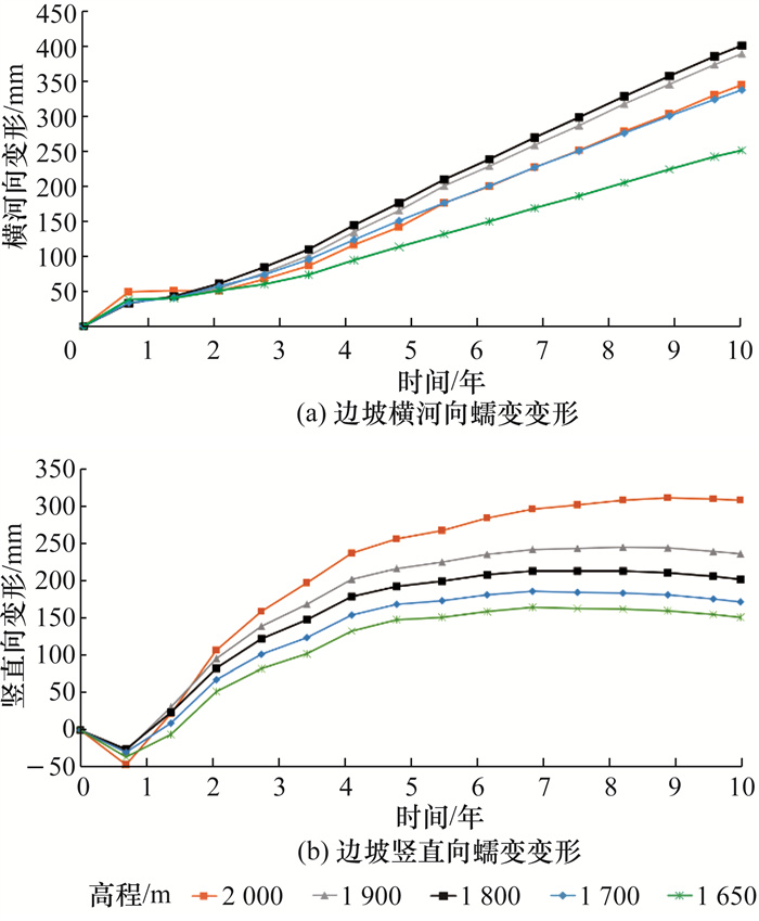 蠕变计算结果如图 16所示,边坡横河向变形在下切完成10年后仍未达到稳定状态,而边坡竖直向蠕变变形在河谷下切完成后第6年达到稳定状态。实测监测资料显示,左岸边坡竖直向变形量极小且已达到稳定状态,而高高程横河向变形仍在持续发展,进一步印证了构造应力对边坡变形的影响已经消散。