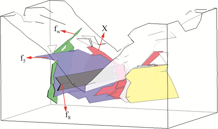 2 河谷演化数值模拟 2.1 计算模型本文所建模型模拟范围为2 000 m×2 740 m× 1 600 m。顺河向:上游至距离坝轴线约1 540 m的解放沟坝址勘探线;下游至距离坝轴线约800 m的二道坝坝轴线。横河向:左岸距坝体中心点1 230 m;右岸据坝体中心点1 100 m。高程方向:海拔1 100~ 2 700 m (河谷底部高程1 100 m,拱坝顶部高程1 885 m)。网格节点总数为122 783个,单元总数为115 307个。该模型模拟了煌斑岩脉X和断层fw、f5、f8等,如图 2所示。