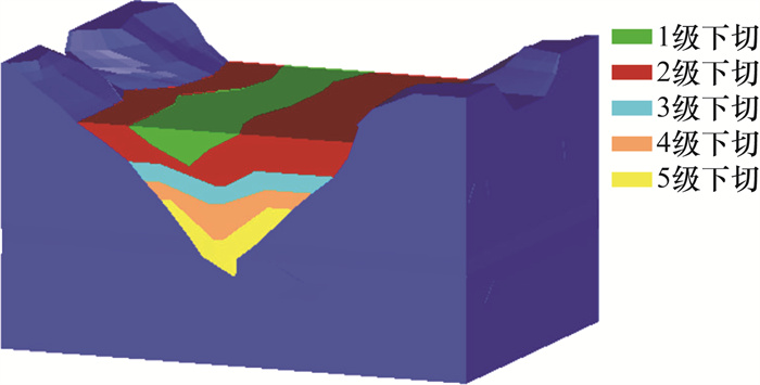 模拟河谷从平坦地面下切至现在形状,即从2 400 m高程下切至现在河床高程1 600 m,分5级下切,如表 2所示。由于河谷下切年代久远,难以确定各级下切过程的岸坡线。因此,根据河谷两岸不对称特点,结合现在坡岸线确定下切过程的河谷轮廓线,如图 3所示。
