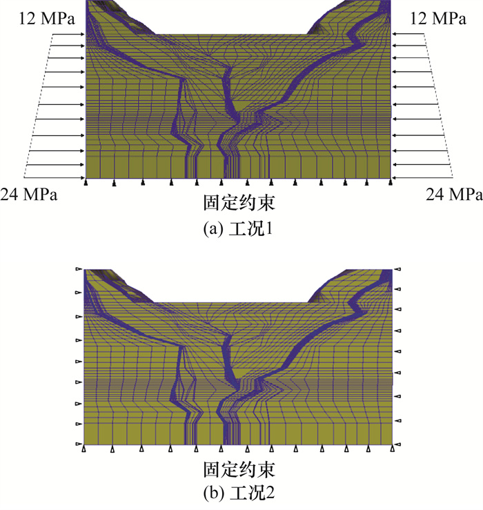 文[16]根据实测地应力资料,分析了锦屏河谷构造应力的大小,采用横河向施加对称12 MPa、顺河向施加对称8 MPa平面应力的方式模拟构造应力。本文结合所建模型情况,采取的边界条件分为2种工况,如图 4所示。