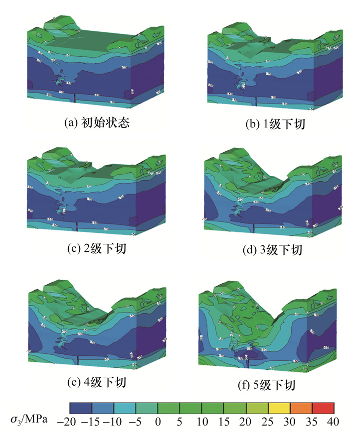 工况1河谷下切过程主拉应力σ3如图 5所示。σ3等值线分布较均匀,云图沿河谷呈基本对称分布,但在断层处出现突变。随着河流逐级下切,σ3最大值逐渐减小,在相同高程处,坡体内部岩体的σ3值高于坡体表层岩体,且呈由内向外逐渐减小趋势,这表明河谷下切对边坡有明显卸荷作用。此外,河谷下切过程中,谷底岩体出现应力集中,其σ3值高于同高程其他岩体,第5次下切最明显,这一规律与文[16]的研究一致。值得注意的是:最大主应力以压应力为主,随着下切进行,部分区域出现拉应力,并且左岸拉应力区域大于右岸。