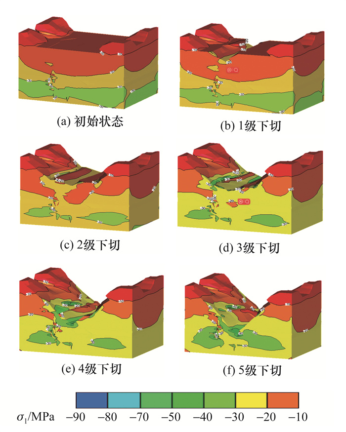 1) 采用弹塑性模型进行河谷下切数值计算,分5级开挖模拟河谷下切。