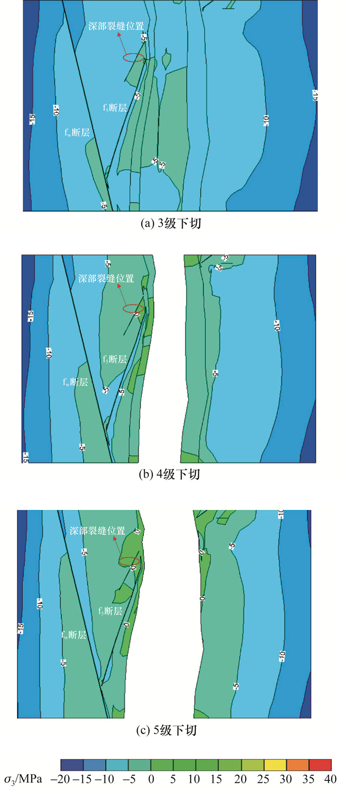 图 7为3~5级下切1 930 m高程的σ3值剖面云图。随着下切进行,模型深部裂缝位置对应的σ3值不断减小,在4级下切时,煌斑岩脉X向坡外的岩体出现拉应力,5级下切时拉应力区域扩大至煌斑岩脉X以内区域。由于岩体抗拉性较弱,因此河谷下切形成的拉应力达到一定程度会造成该位置岩体破坏,拉应力向岩体深部发展形成深部裂缝。