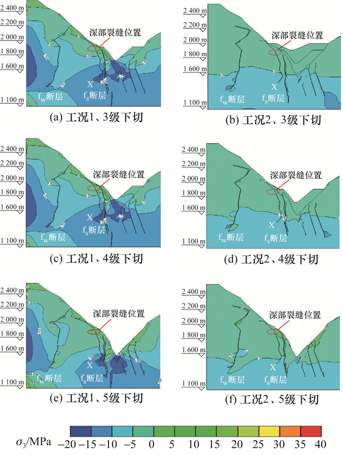 图 7中河谷下切在右岸形成的拉应力区主要分布在坡体表层位置,而左岸受煌斑岩脉X和断层f5影响,拉应力区扩展至深部裂缝区域。此外,左岸拉应力区比右岸发育得更深,这与左岸发育深部裂缝和右岸极少发育深部裂缝的工程实践相符。由此可知,锦屏左岸边坡复杂地质条件(煌斑岩脉、断层等软弱带)是形成深部裂缝的原因之一。图 8为2种工况下深部裂缝位置对应的横河向剖面σ3值云图。无论是否施加构造应力,随着河谷下切进行,深部裂缝位置的σ3值不断减小,呈现明显的卸荷特征。如不考虑构造应力,煌斑岩脉X向坡内的岩体未出现拉应力,而1 930 m高程PD44平洞附近深部裂缝分布在煌斑岩脉X两侧;在施加构造应力情况下,左岸拉应力区域深度明显增加,并且在5级下切后煌斑岩脉X两侧均出现拉应力,与工程实践深部裂缝分布位置相符。这表明:构造应力使边坡卸荷深度加深,锦屏左岸边坡构造应力作用下的高地应力特征是形成深部裂缝的原因之一。