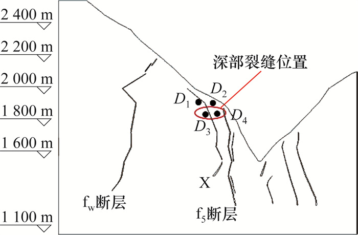 1 地质条件锦屏左岸边坡工程规模较大,坝址区自然边坡高度超过1 500 m,工程边坡高度达530 m,总开挖量约550×104 m3。坝址区自然边坡地质条件复杂,为典型的深切V形河谷反倾向边坡,坡度为40°~50°,相对高差上千米。海拔约1 820 m以上的地层主要为砂板岩,1 820 m以下为大理岩。锦屏左岸边坡主要地质构造特征如表 1[22]所示,岩体中有诸多不良地质构造,如煌斑岩脉X,断层f2、f5、f8、f42-9,以及一系列规模不等的张开裂缝和深部裂缝等,这些构造使锦屏左岸上部形成深度较大的Ⅳ2类岩体,岩体刚度明显低于右岸。锦屏左岸边坡的深部裂缝大致分为2类:一类是边坡卸荷深度远超以往工程实践,从边坡表层至深部200~300 m均有裂缝发育,因卸荷深度大,所以称为深卸荷,其中1 930 m高程最为典型,如图 1a所示;另一类是在边坡浅表层卸荷带和相对完整的岩体后,边坡岩体深部300 m左右出现的卸荷裂缝,称为深拉裂缝,深拉裂缝主要集中在1 780 m高程,如图 1b所示。