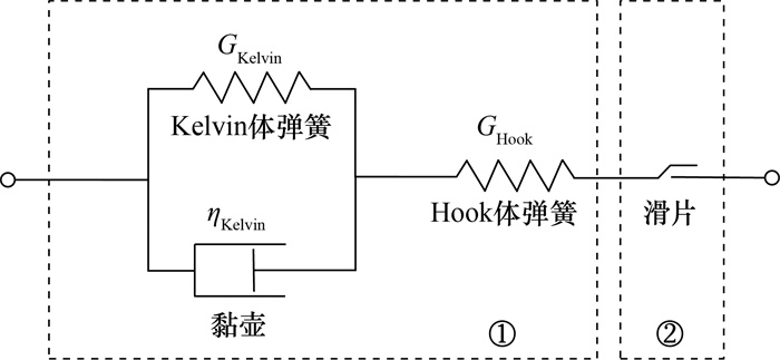 2) 采用黏弹塑性模型体现围岩流变特性并考虑围岩-衬砌真实相互作用,如图 1所示。该模型由广义Kelvin体单元和塑性单元组成,前者反映了围岩随时间变化的变形过程,后者反映了岩石的塑性屈服行为。图 1中,①为黏弹性部分,②为塑性部分。G(t)、K(t)分别为黏弹性模型的剪切和体积松弛模量,表示如下: