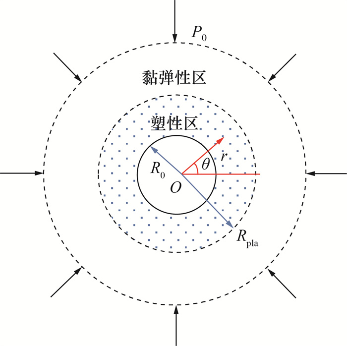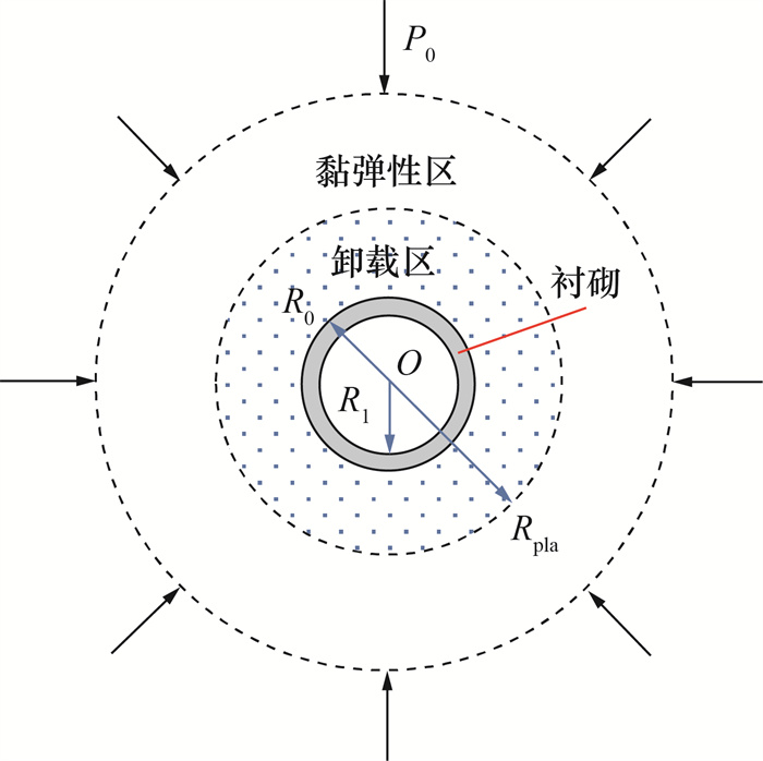 施工过程分为2个阶段。开挖阶段T1(0≤t < t1):当t=0时,隧道立即开挖;同时,在开挖阶段内,对隧道周边环境进行持续监测,确保衬砌施工安全。简化后的力学模型如图 2所示。其中,R0为隧道的开挖半径,Rpla为塑性区(plastic zone)半径。当R0 < r < Rpla时,区域为围岩的塑性区;当r>Rpla时,区域为围岩的黏弹性区。开挖阶段没有水流动,因此没有附加应力产生。该阶段只需分析开挖释放荷载下的单一力场。