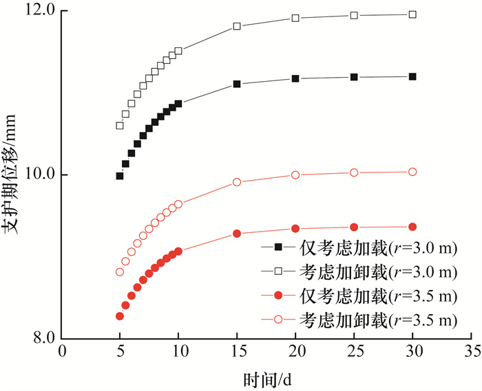 图 4给出了正确考虑加卸载路径(考虑加卸载)和未正确考虑加卸载路径(仅考虑加载)2种情况下,卸载区r=3.0 m和r=3.5 m这2个位置的位移随时间变化的情况。可以看出,正确考虑加卸载路径情况下,其位移明显大于未正确考虑的情况,即考虑应力路径影响后围岩变形会偏大,说明不可恢复的塑性应变的确会在卸载区引起额外的随时间变化的位移和应力,并且这种影响不可忽略。