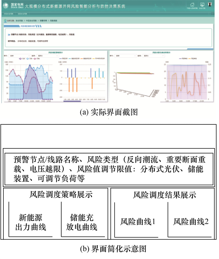 该系统已应用于省、市和区级的主配网安全、平衡和消纳方面的风险评估与防控,为了更清晰地展示其应用界面,依据实际界面的实时截图(见图 12a),绘制了简化示意图(见图 12b)。其中,全省供电分区分布图展示了全省供电分区分布,以及省、市和区级电网信息总览(供电分区数量、220 kV变电站数量、分布式电源数量、分布式电源容量);省级和区级电网与分布式新能源基本信息栏展示了常规电源装机、集中式新能源装机、分布式装机、负荷年统计值(均值、极值);省区运行时序图展示了机组最大最小开机、受入功率、调度负荷、常规电源出力、集中式新能源出力、分布式新能源出力、分布式新能源消纳空间以阴影表示;平衡与消纳风险评估栏展示了正负备用不足评估和弃风弃光评估结果、风险等级以及风险值。
