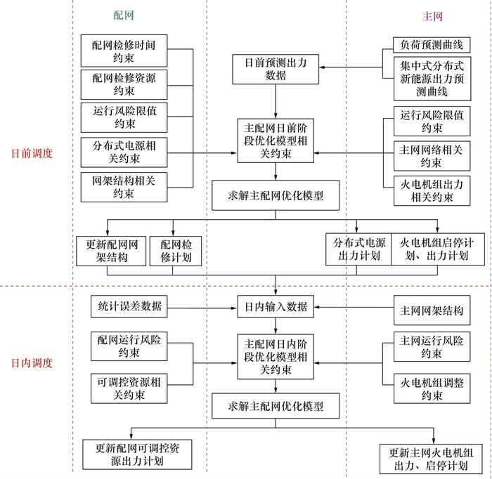 2.1 主配网风险辅助决策针对含多类型运行风险的主配网风险辅助决策的流程如图 2所示。本策略在日前阶段构建主配网总运行成本最小的日前优化调度模型,模型中同时协调4个维度比如电源侧、电网侧、负荷侧和储能侧的可调控资源,同时考虑主配网运行风险限值约束;在日内阶段构建的日内优化调度模型充分考虑电网安全性指标,以主网和配网的综合运行风险值最小化为目标,针对分布式能源不确定带来的日前预测偏差,通过储能策略以及可中断负荷响应策略调整平抑偏差量,尽可能降低主配电网各类运行风险。传统的主配网优化大多集中于经济优化,少数考虑电网运行风险约束,且模型中可调控资源选择较为单一,日内阶段大多选择将运行风险转化为风险成本进行经济性研究,并未充分考虑电网安全性指标[10-13]。