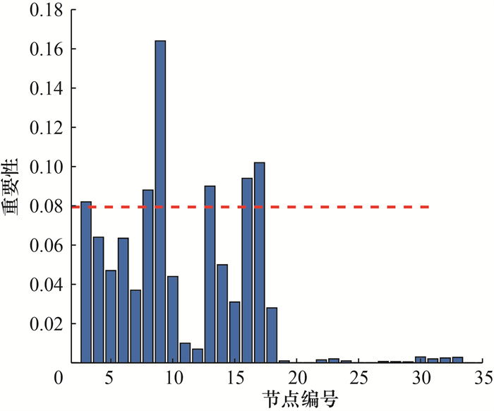 为了实现统计意义上的风险特征提取,采用交流最优潮流模型计算节点和线路数值[33],随后结合海量场景以及上述风险指标,生成风险数据集。设定标签为0表示该场景下没有风险发生,标签为1表示该场景下发生了风险。为了直观地提取运行风险发生时的特征,将该数据集的特征定义为系统节点的有功和无功负荷。通过特征叠加的方式最终得出节点的重要性。