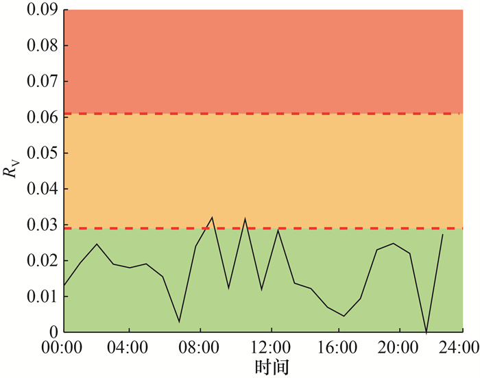 将本文提出的主配网风险评估指标体系在中国某地区电网进行风险数值计算,作为实际应用验证。如图 6所示,以2021年8月12日运行数据为例,电压越限风险在09 ∶ 00—14 ∶ 00时段和17 ∶ 00—21 ∶ 00时段的风险均较大,前一时段主要是因为分布式光伏出力较大,后一时段主要是因为系统负荷较大,结果表明所提指标体系能够全面衡量系统运行时所面临的风险,并能够准确判断风险等级,具备有效性。