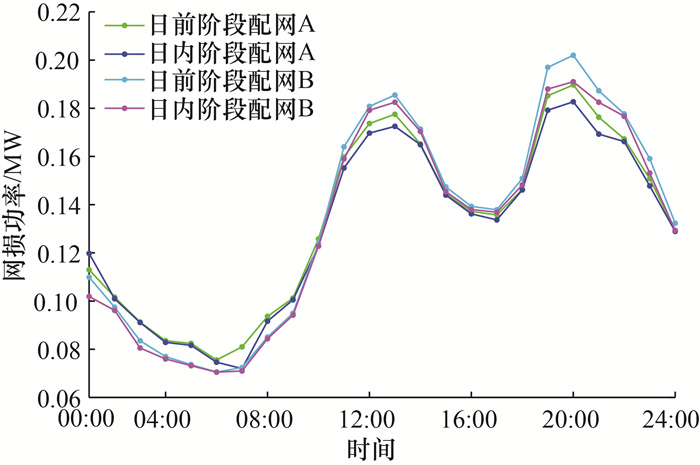 以配网A和B为例,求解日前—日内2阶段风险调度模型,得到日前与日内阶段配电网网损的对比曲线。如图 7所示,日内阶段通过对主配网联络线、储能装置以及可中断负荷进行的适当调整,能使配网的网损曲线波动幅度降低,网损曲线较为平缓。相较于日前调度之后的网损曲线,日内考虑综合风险的调度能够进一步减少配网的网络损耗,并且减少网损大幅度波动。