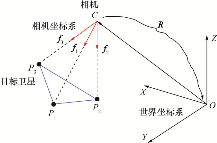 1 算法原理 1.1 定位原理Kneip算法[19]是一种闭合解的P3P求解方式,具有求解稳定、速度快的优点。该算法通过引入相机和世界坐标系的中间坐标系,计算相机中间坐标系和世界中间坐标系之间的相对姿态和位置,求解相机的位姿,如图 1所示。其中:C为相机(镜头)中心点;P1、P2、P3为目标卫星;给定P1、P2、P3的位置坐标和视线矢量f1、f2、f3,可求出相机相对于世界坐标系的C和R,具体步骤如下。