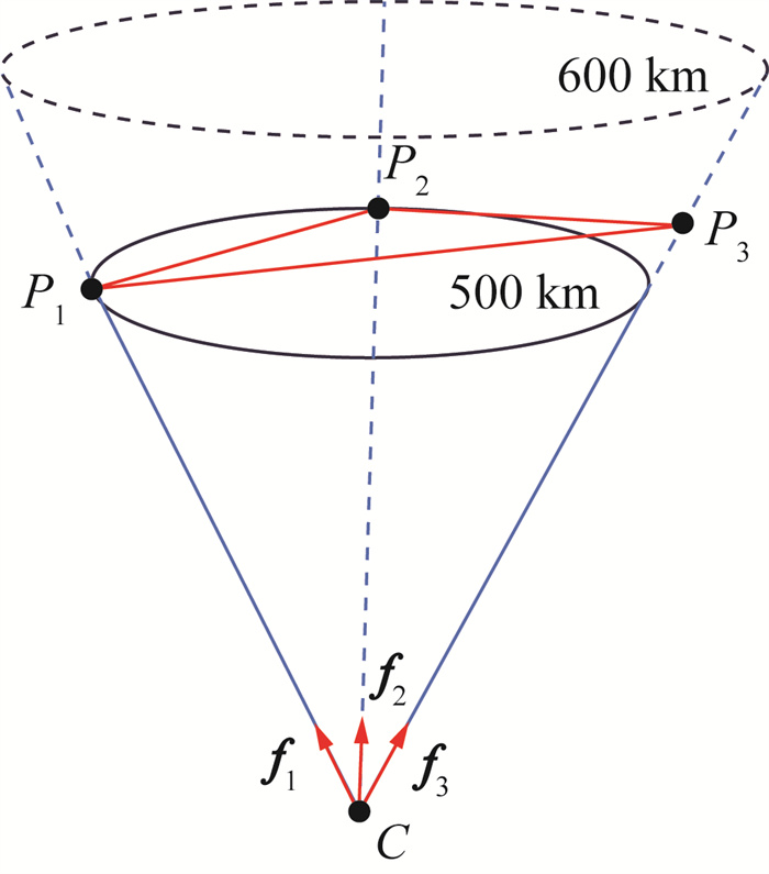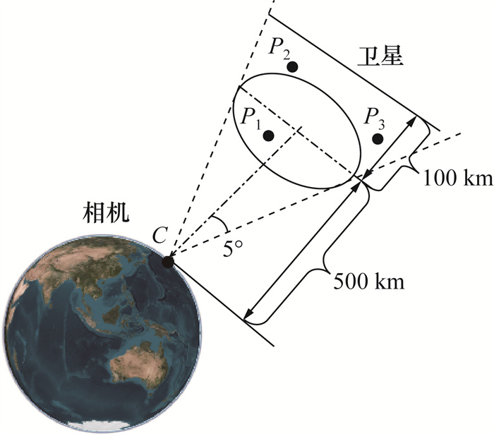 2 星座构型对定位误差的影响本文为提高P3P定位精度,利用Monte Carlo仿真研究视场内可见目标卫星与定位点的几何构型对定位误差的影响,优选量测信息源。研究中假设待定位相机固连于舰船上,待观测卫星轨道高度分布在500~600 km。鉴于相机视场越大,几何构型表征可视性越强,本节相机分辨率设定为1 024 ×1 024 pixels、视场为60°×60°,如图 3所示。不失一般性,像平面添加均值为0.040 pixels、方差为0.004 pixels的Gaussian噪声。